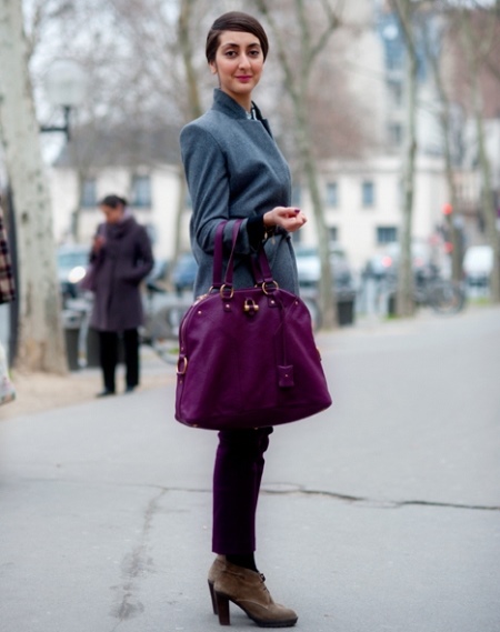 Handbags of plum, pues and purple hues are well suited as the finishing touch of a business image. They need to be worn with trouser suits, fitted blouses, pencil skirt, dress.