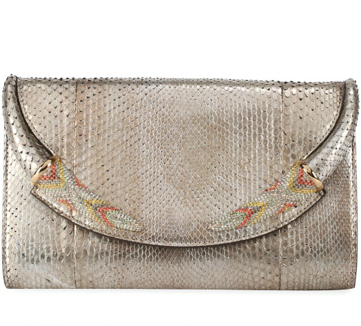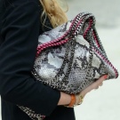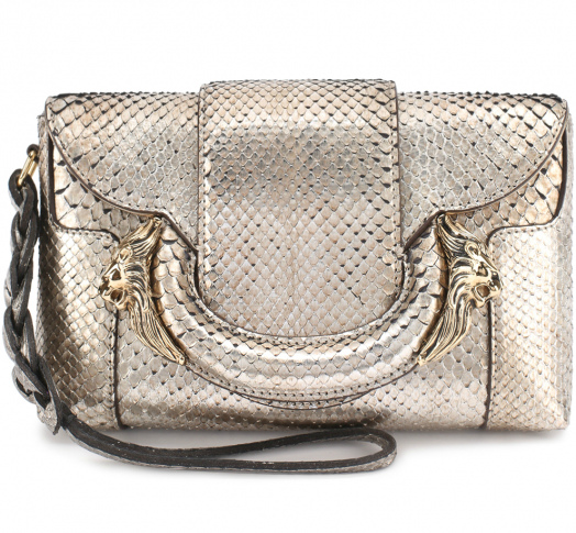 Python bags are in the collections of accessories of many fashion houses. Original, stylish and luxurious looks a model with a silver sheen from Roberto Cavalli. This is a small handbag with a hand strap. This accessory is suitable for almost any evening dress. Her discreet colors will appeal to girls who do not particularly like snake print.