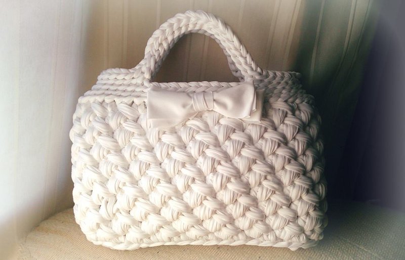 - a handbag made of thin ribbon yarn will be combined with a light flowing dress or a skirt to the floor; high-heeled shoes or sandals will complete the romantic look;