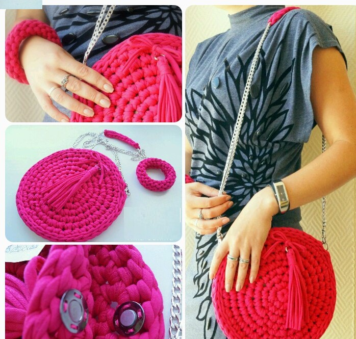 A round handbag made of ribbon yarn can be crocheted in a circle, starting from the center, and with the help of special circular knitting needles. Such products are now at the peak of popularity, it is literally the must-have of this season.