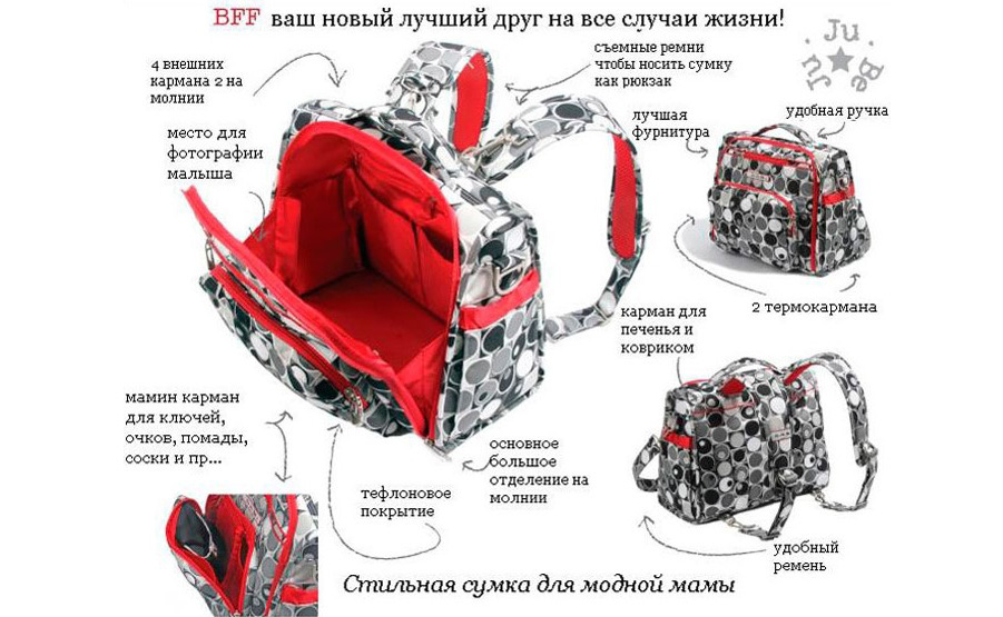 The quality of Ju-Ju-Be bags has already been estimated by a huge number of mothers. This is evidenced by numerous positive reviews on the Internet. Buyers note that the bags, including small ones, are very roomy.