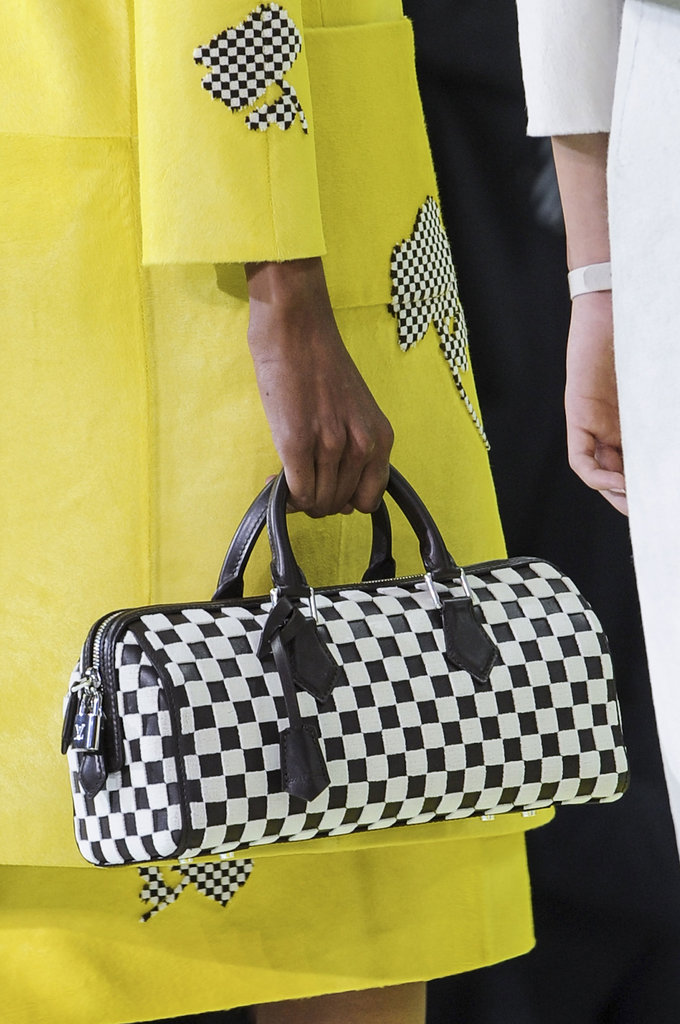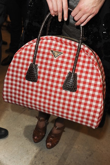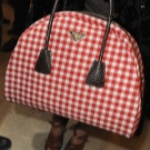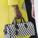 Consider in detail several interesting images, complemented by a checkered handbag.