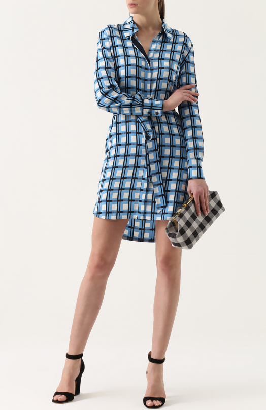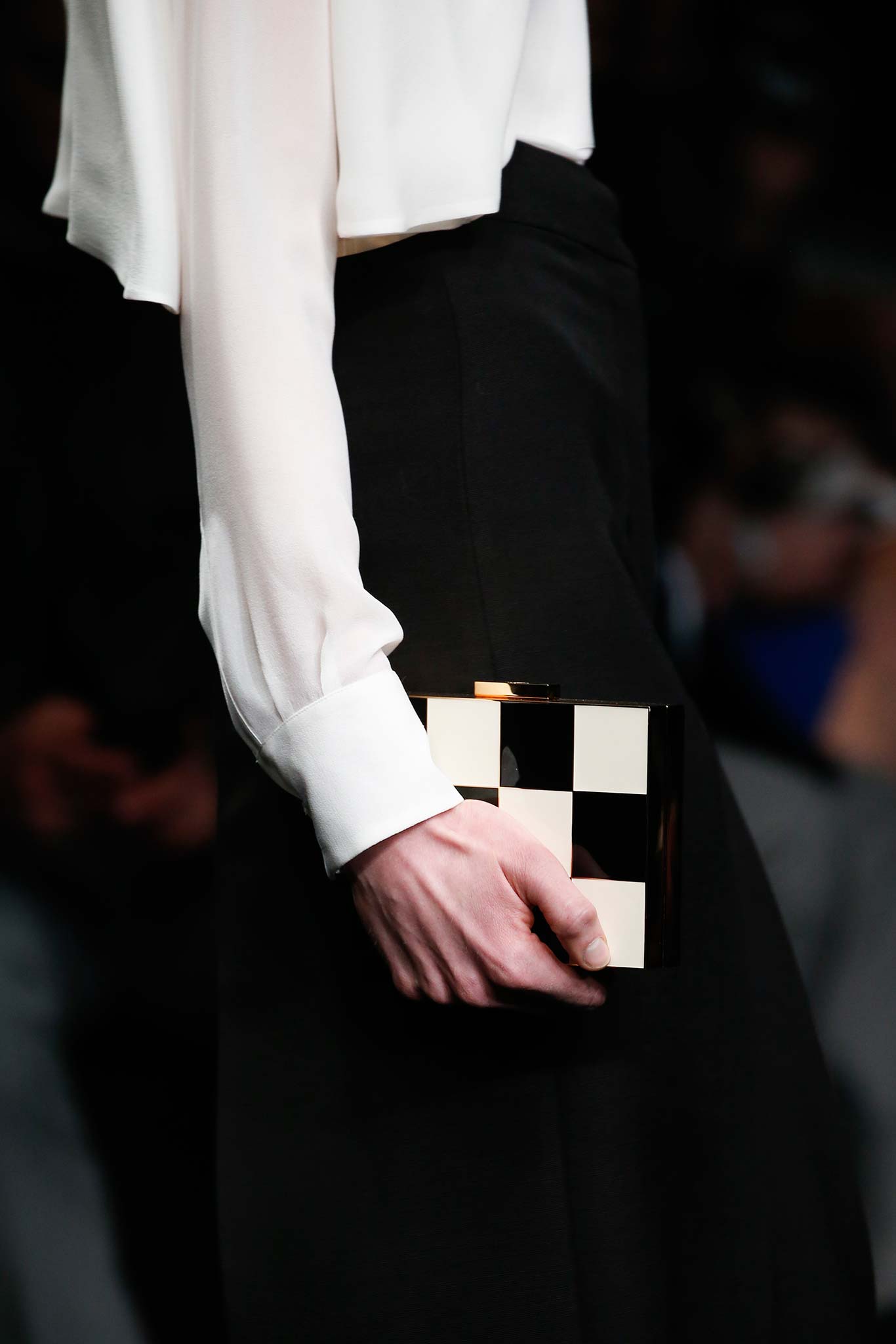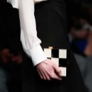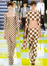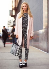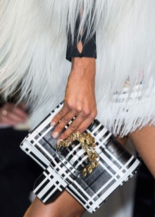 A stylish accessory can complement the business ensemble. To do this, it is better to pick up a bag with a geometric shape with a dark cage. It will be harmoniously combined with a trouser suit, straight trousers and a white shirt or business dress with a white collar.