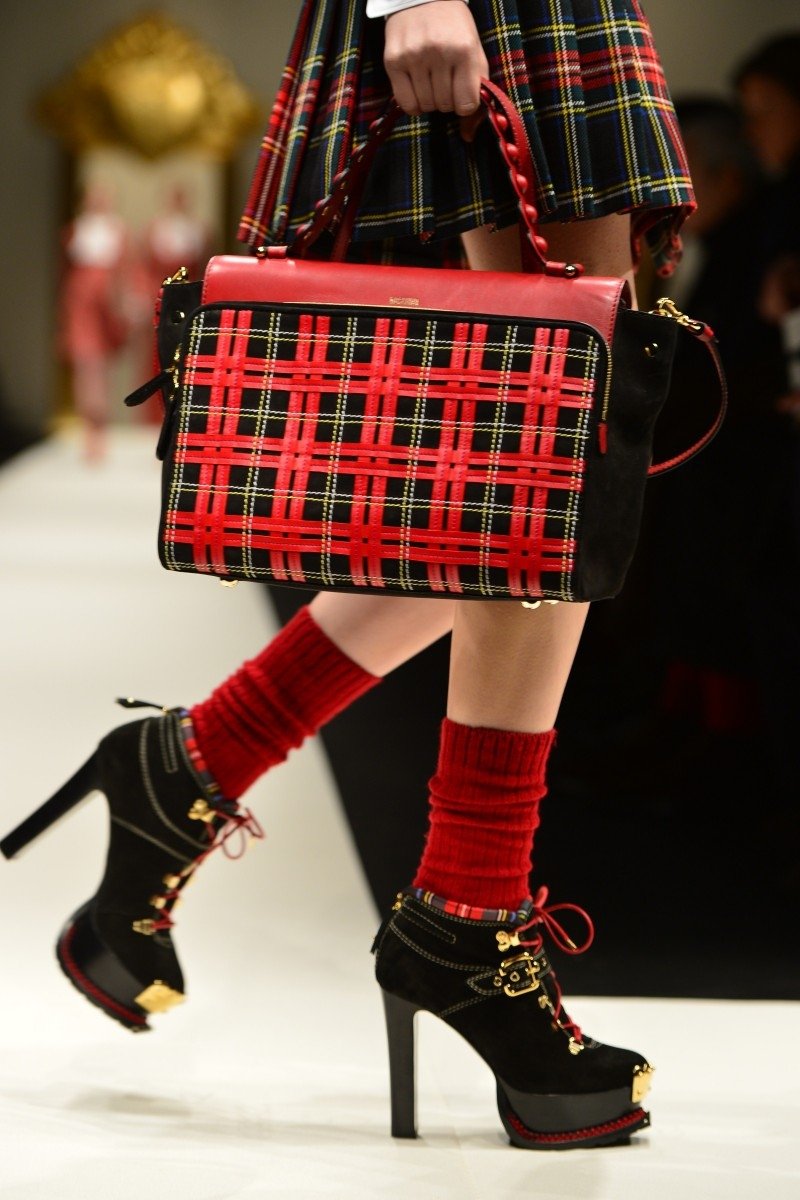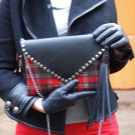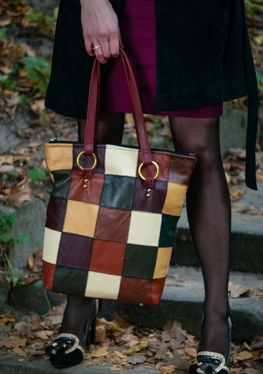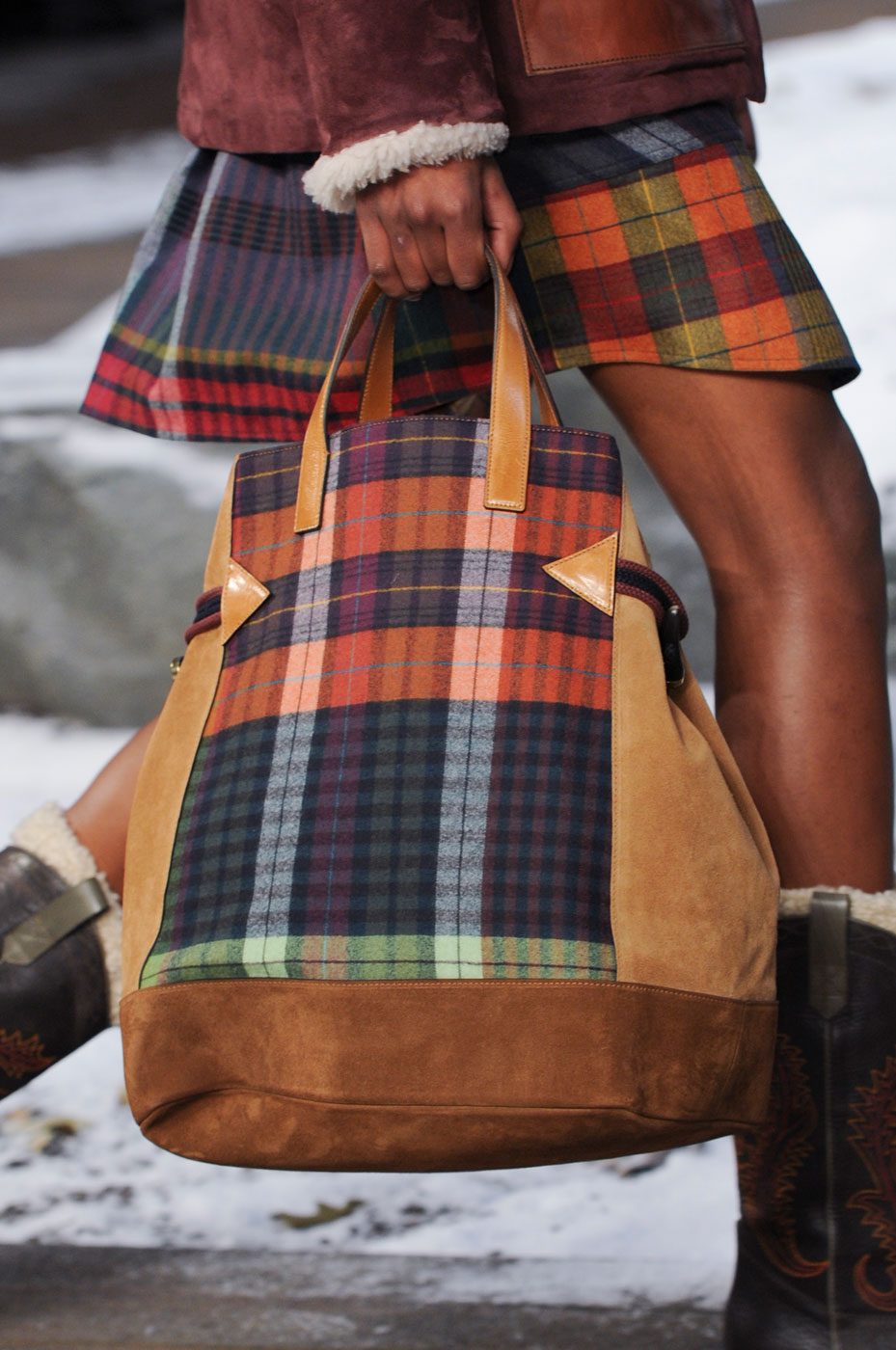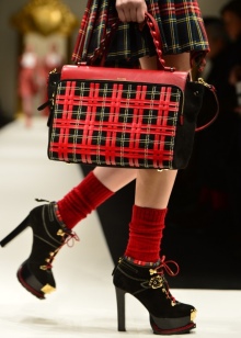- In winter, a suede plaid bag will perfectly match a skirt in a similar cage, a dark brown sheepskin coat with white fur and high black boots with a small heel.