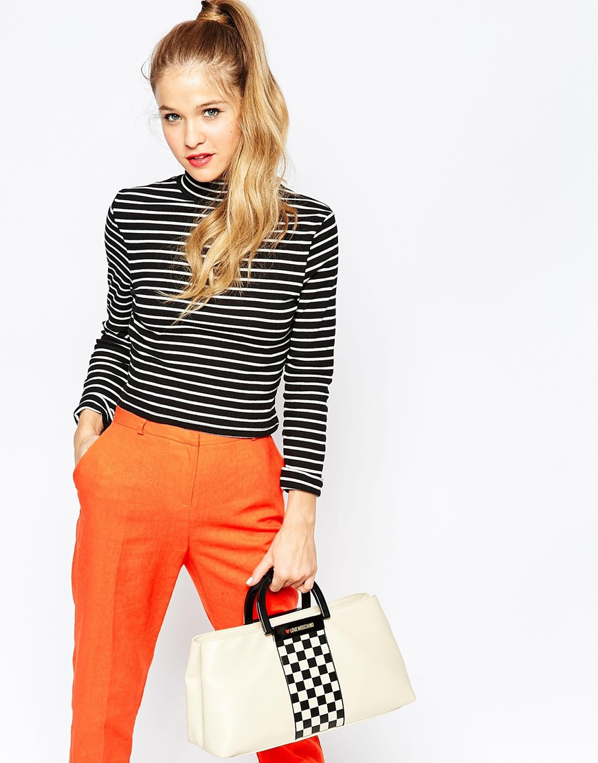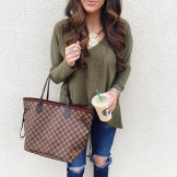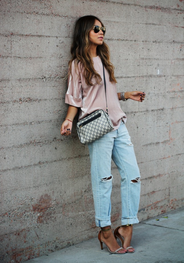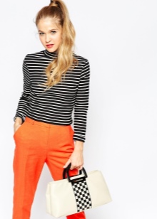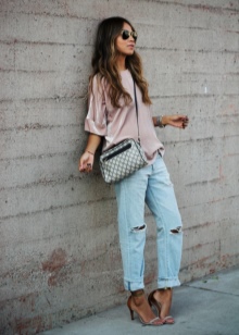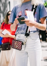 The accessory looks beautiful in a casual ensemble consisting of narrow jeans, a top, a T-shirt or a long-sleeved blouse. For such a set, you can pick up a bright handbag or a dark model. Choose such products in which at least one color matched the color of your clothes.