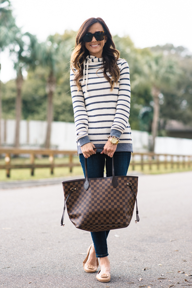 - For a simple yet stylish casual look, choose skinny blue jeans, a black-and-white striped sweater, and beige ballet flats. You can decorate the ensemble with the help of a dark checkered bag and golden watches.