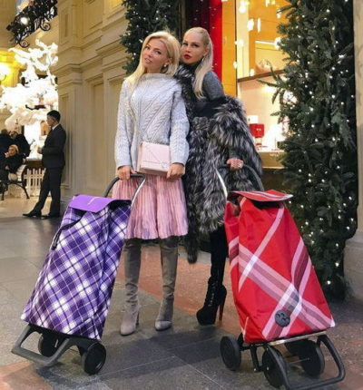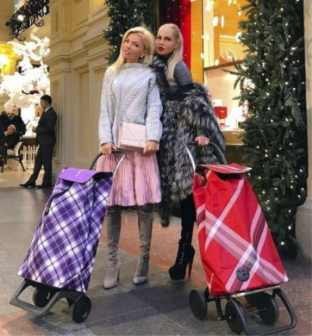 - A beautiful image can be created with a shopping bag on wheels. Choose a model with a red-white or purple-white cage. If the weather is cool, wear a pale pink knee-length skirt, a light jacket or a warm sweater and complete the ensemble with gray suede boots with a white heel and a white shoulder clutch.
