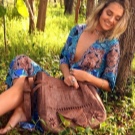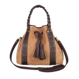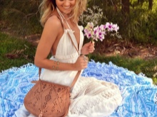 The pretty handbag in brown tones is made in the boho style and will perfectly fit into the image in the same style. It is necessary to choose a brown dress with an unobtrusive print, a light black cardigan and sandals - gladiators.
