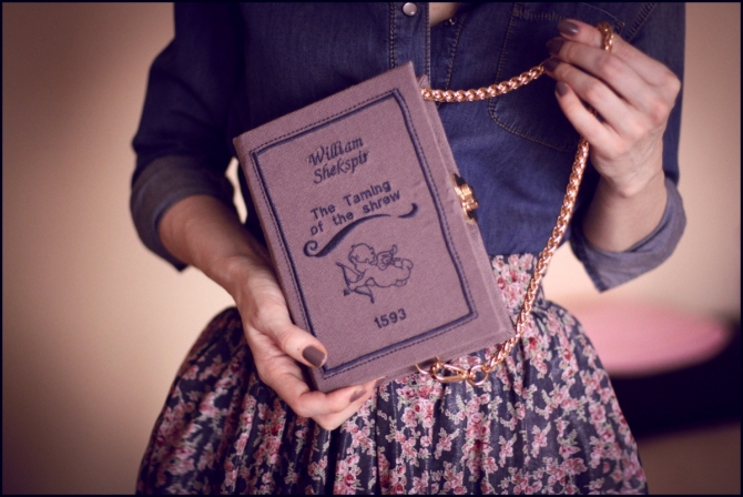A soft feminine look, consisting of a fluffy dark skirt with a floral print, denim shirt and neat boat shoes, needs an appropriate addition. Unusual handmade bag in the form of a book on a chain will be a great accessory for a dress.
