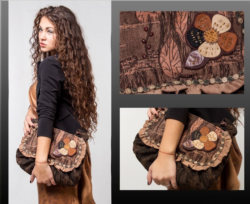 The combination of brown, sand and lemon shades can be found quite often in models of handmade bags. Soft tones of warm colors attract attention and have to themselves, besides, perfectly fit into the wardrobe, dominated by light shades.