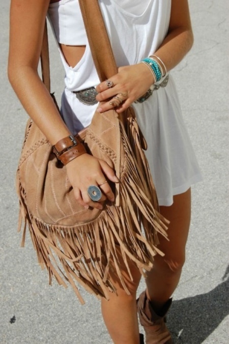 A stylish sandy-colored bag with a long fringe will appeal to many girls. The model is good for summer and will be perfectly combined with a loose white mini-dress, brown summer ankle boots and a strap with emerald stones that adorn the waist.
