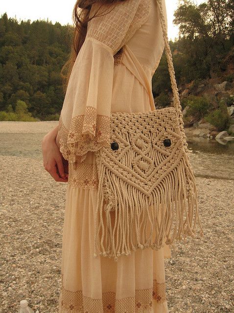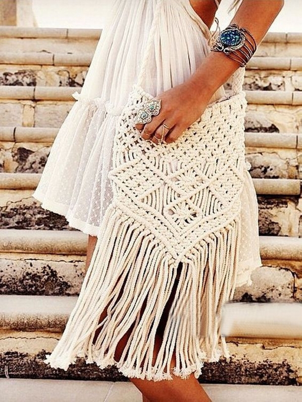 Another option would be a light summer dress in country or boho style. Floral print or Indian patterns "cucumbers" - the choice is yours. It will look more interesting if the color of the handbag will overlap with the color of the sundress or some of its details. If your skill in weaving macrame patterns is well developed, then you will be able to independently make several bags for each outfit.