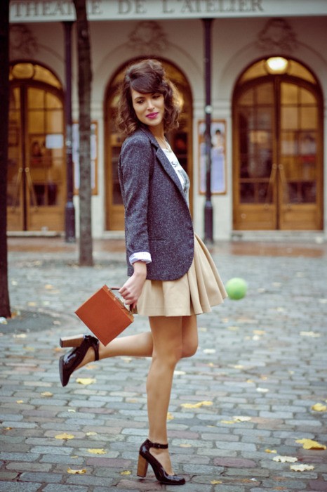 - A chic evening ensemble can be created with the help of a black fitting top, a burgundy puffy skirt with a length slightly below the knee and beige high-heeled shoes and a platform. Complete the image of a white or cream clutch with diamond-shaped embroidery and a metallic inset with sparkles.