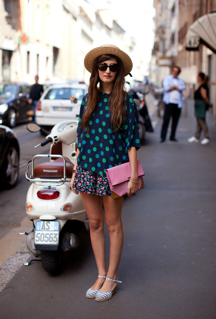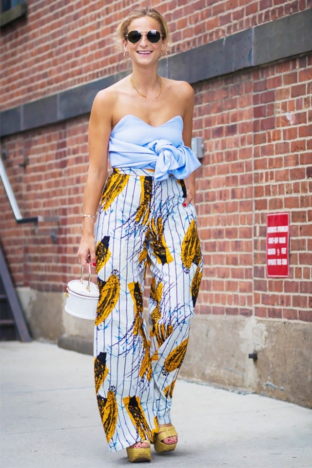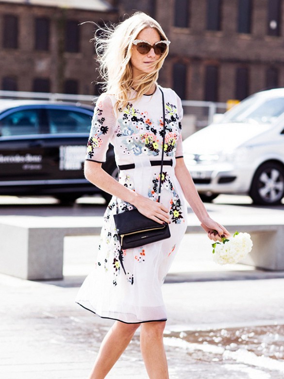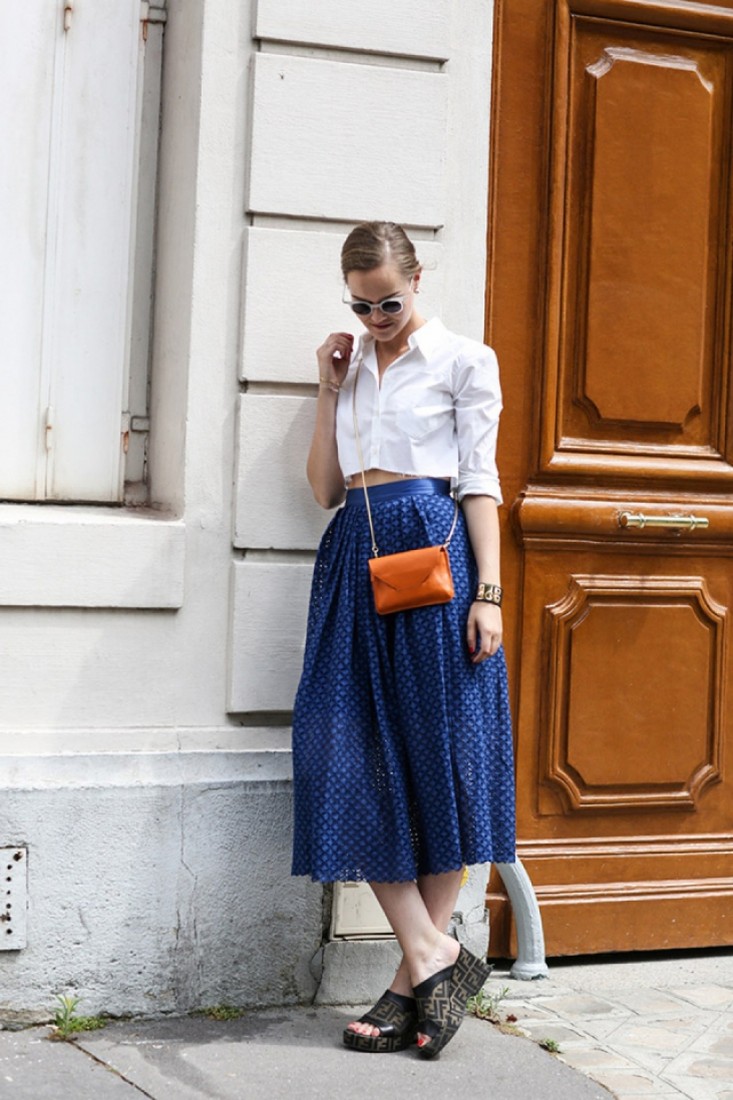 - Light and youthful look will be made of a blue skirt with a floral print, a white blouse, blue sandals with heels and a yellow clutch envelope. A blouse can be easily replaced with a light sweater with a long sleeve, and a skirt with white jeans. In these ensembles, bright accessories with metal fittings will look great.