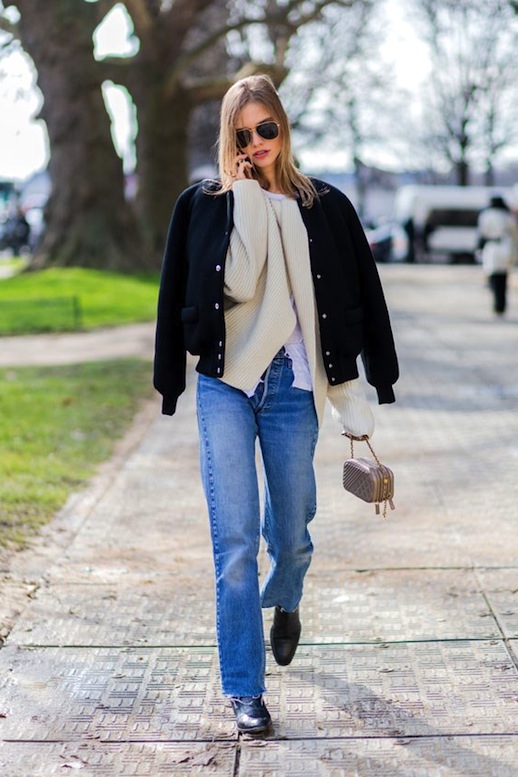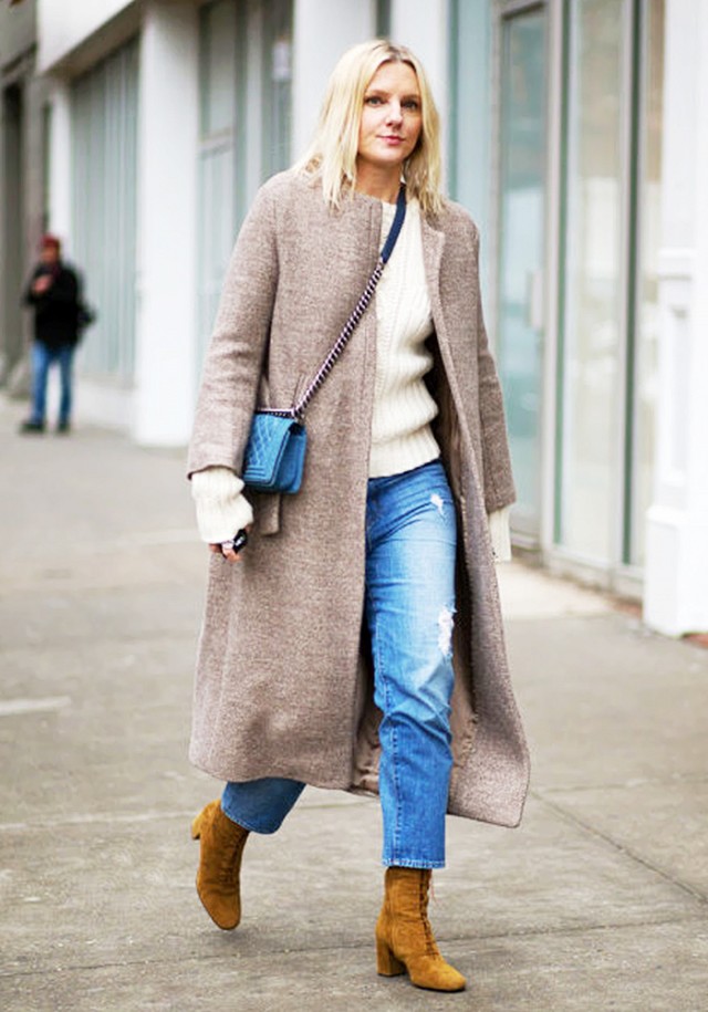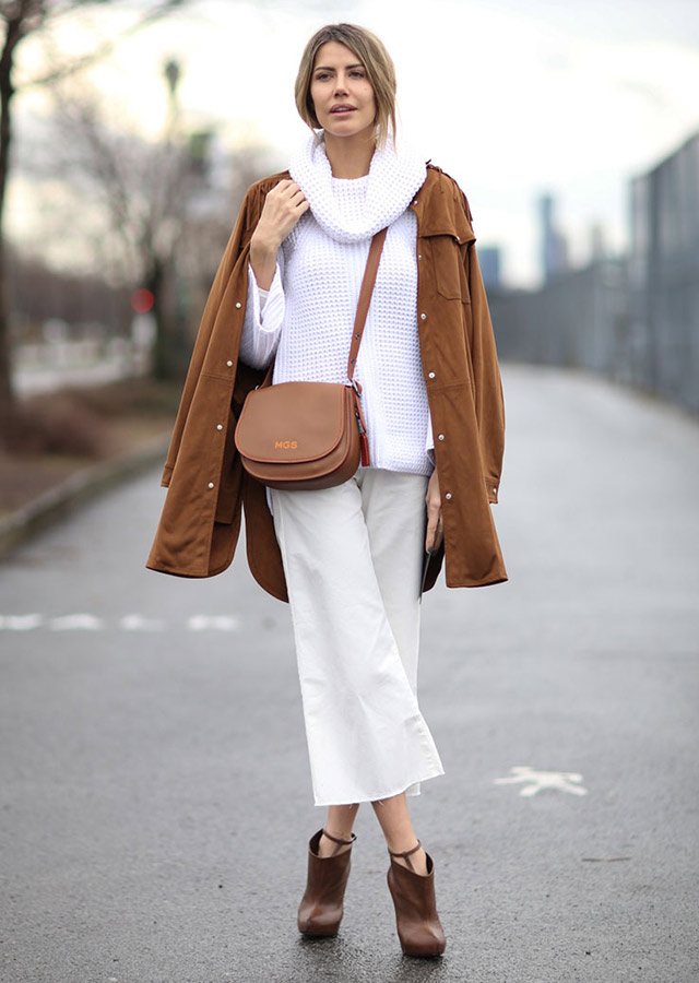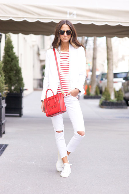 - A stylish casual look is available if you wear a striped top, white ripped jeans, a white jacket and light-colored sneakers. You can dilute this shining kit with a small red shoulder bag and sunglasses.