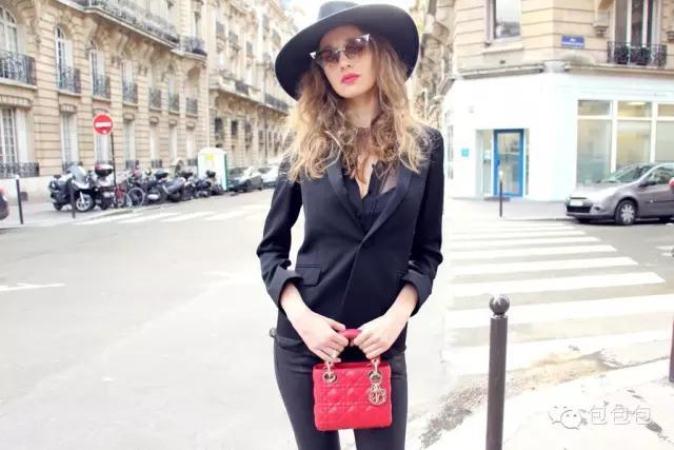 - Sexy and extravagant look can be made up of tight-fitting black pants, a fitted jacket with a long neckline, a black hat and a bright red square-shaped leather handbag. The image can be completed with sunglasses and red lipstick.