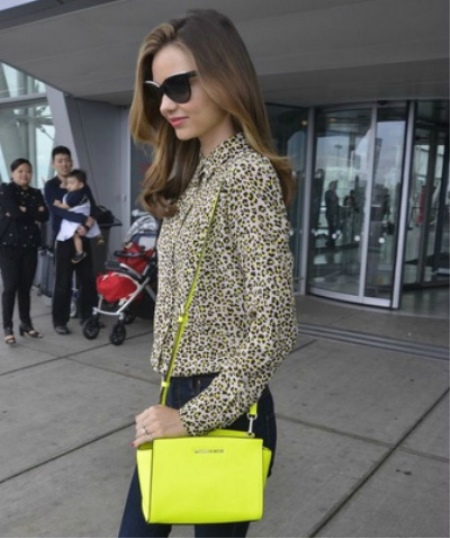 - Wear a black skinny pants, leopard shirt with a high collar and complement this set of bright yellow or green bag over the shoulder. You can complete the look with sunglasses and sharp-cut boats in the color of clothes.