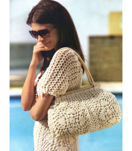 - But an example of a knitted bag is simple and at the same time very elegant. A large crochet makes things light, and a delicate light beige color will accentuate even a small tan.