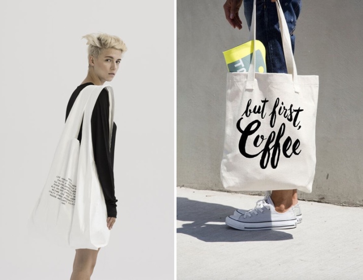 Canvas bags adorned with various patterns and inscriptions are considered to be fashionable and original.. They have the correct geometric shape and handles of medium length. They can be carried both in a hand, and on a shoulder. Soft and natural material allows you to fit many different items in the accessory.