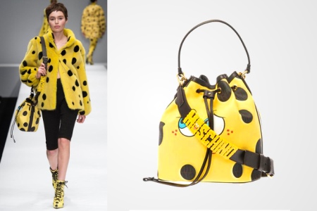 The ready-to-wear 2014/2015 fall-winter collection was partly devoted to the SpongeBob cartoon. The assortment included a clutch bag, a bag-bag, a round crossbody bag and a roomy shopper bag. Each model is yellow in color, with a characteristic print and attractive face of a popular cartoon character.