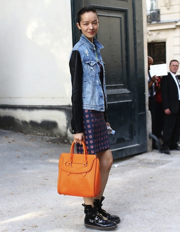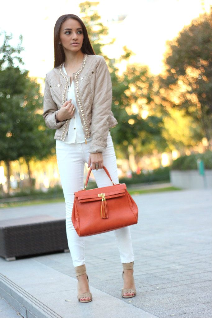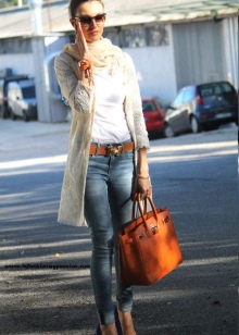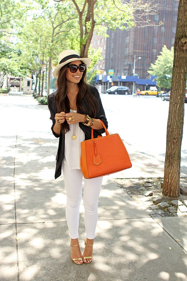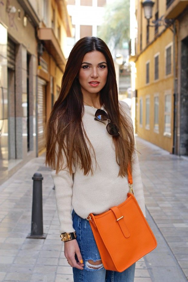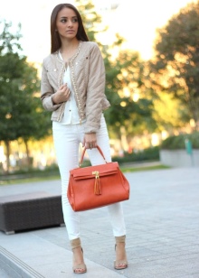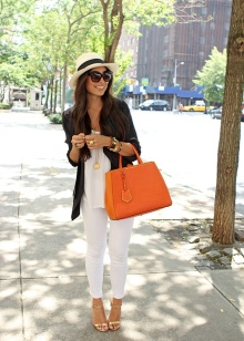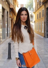 Urban and street styles have a great love for comfortable clothing - jeans, shirts, T-shirts, tops. With all these things, the orange bag fits perfectly. It does not matter what color your jeans will be, in any case, a warm sun accessory will create an interesting contrast. But the shirt should be chosen carefully, simple white models look best.
