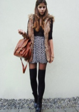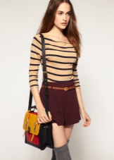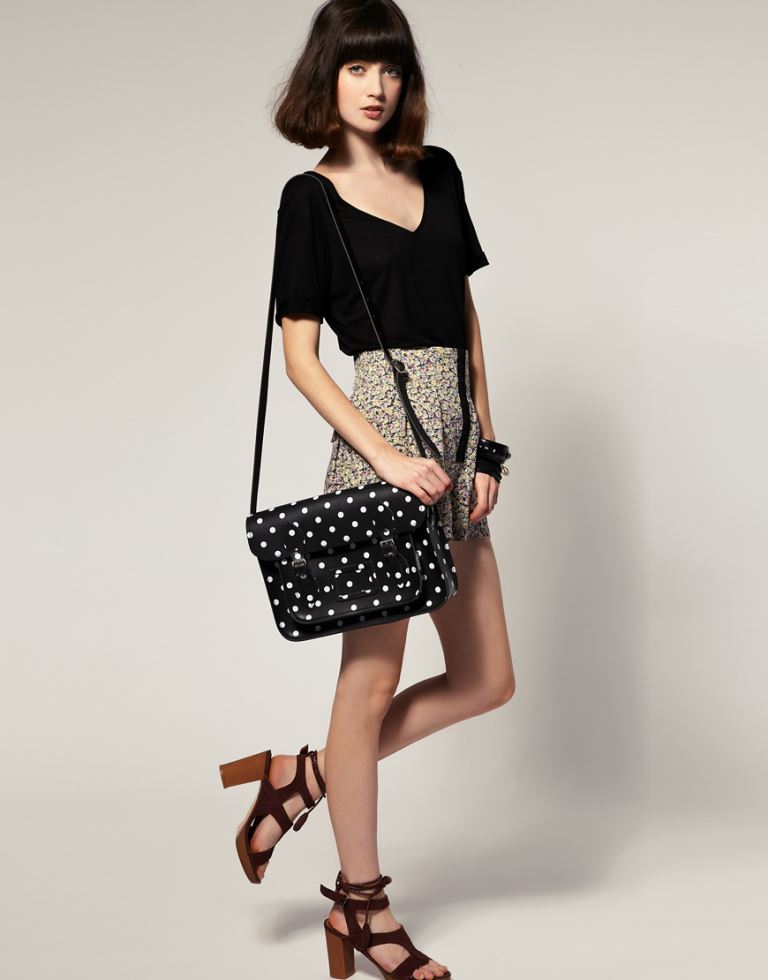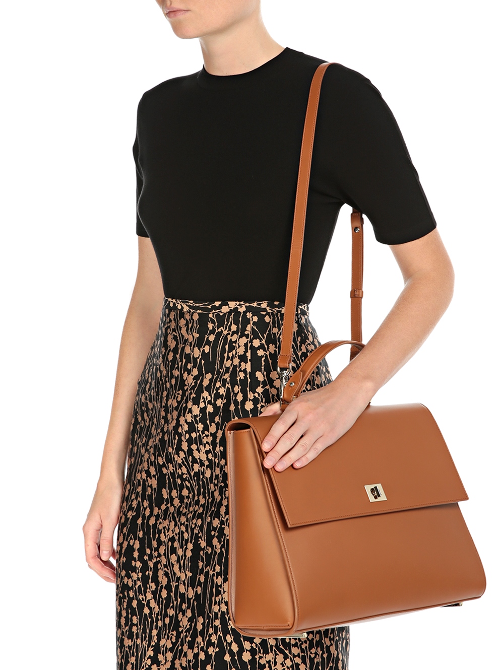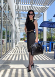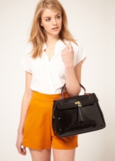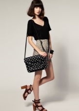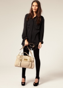 - A large black bag will look spectacular with a beige or white shirt and a caramel leather skirt. Bright pointed boats or shoes with a round nose with a steady heel will be well combined with such an ensemble.