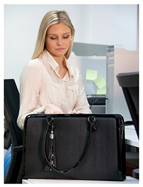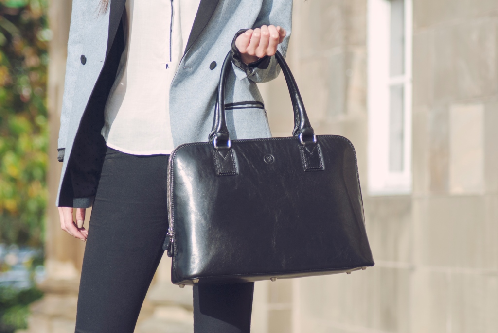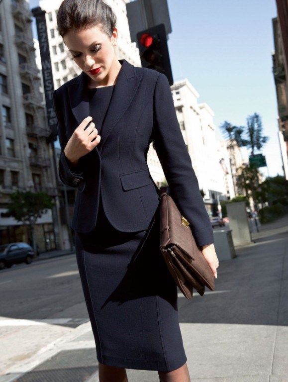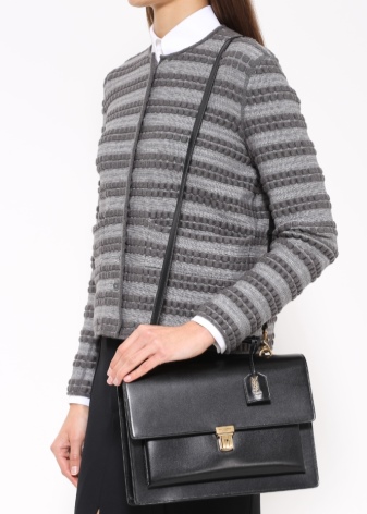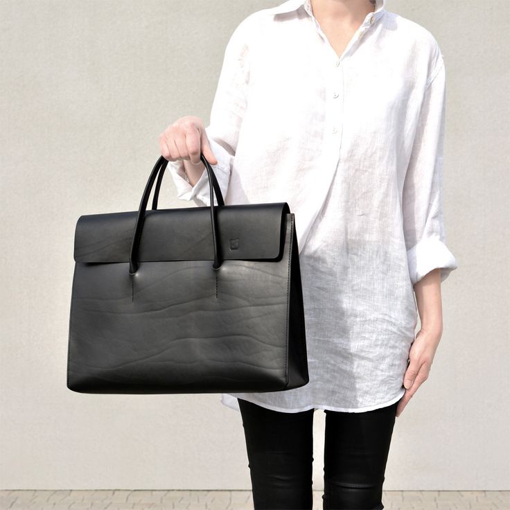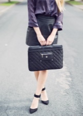 - A rectangular briefcase with a short handle will harmoniously look with a business ensemble of a black jacket and a black skirt above the knee.. Under the bottom you can wear a white blouse or a classic shirt, and shod - black leather shoes with a small heel.