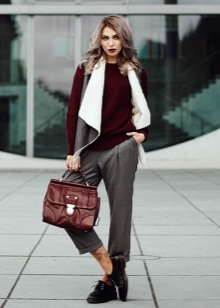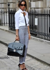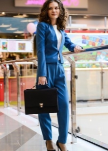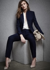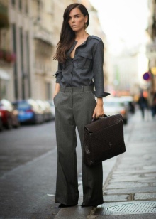 - The most successful is a combination of business pantsuit and briefcase in color. With these outfits look great dark bags with rigid frames. Shoes to these sets should be selected elegant and neat. For example, it can be sharp-nosed leather pumps with a thin heel.