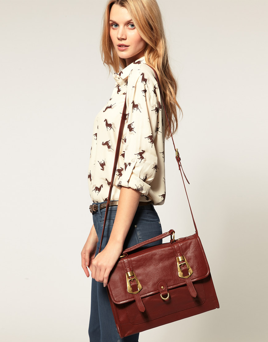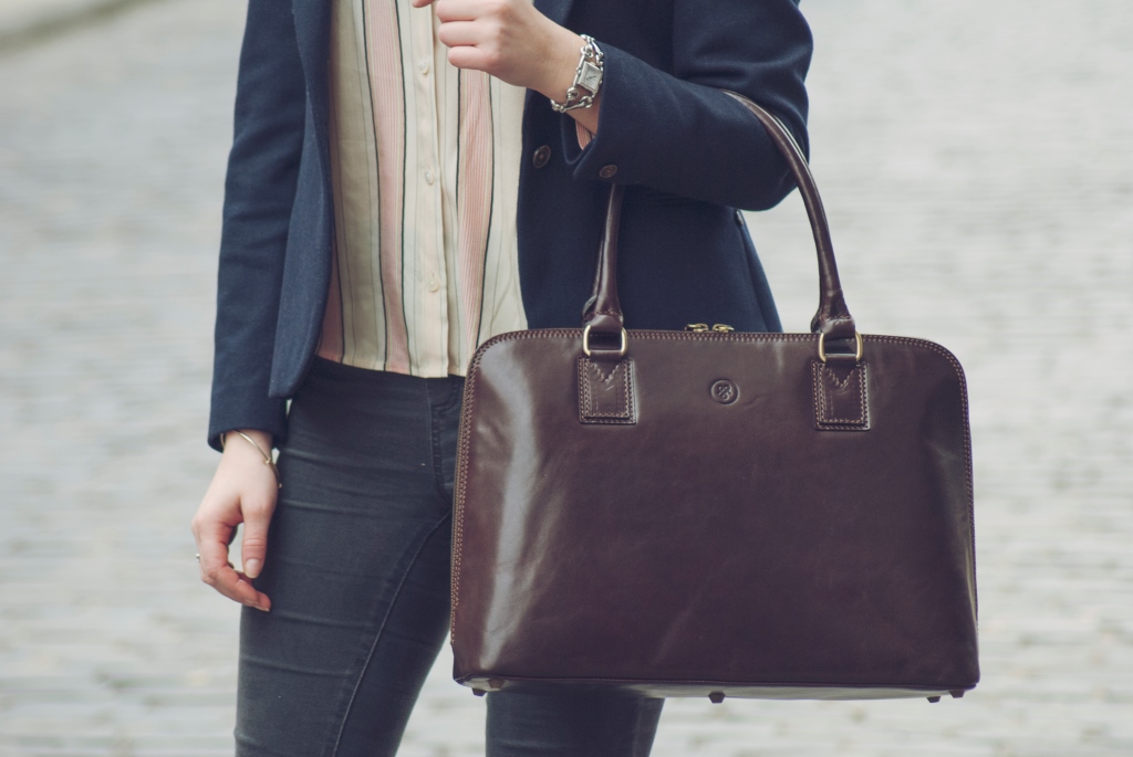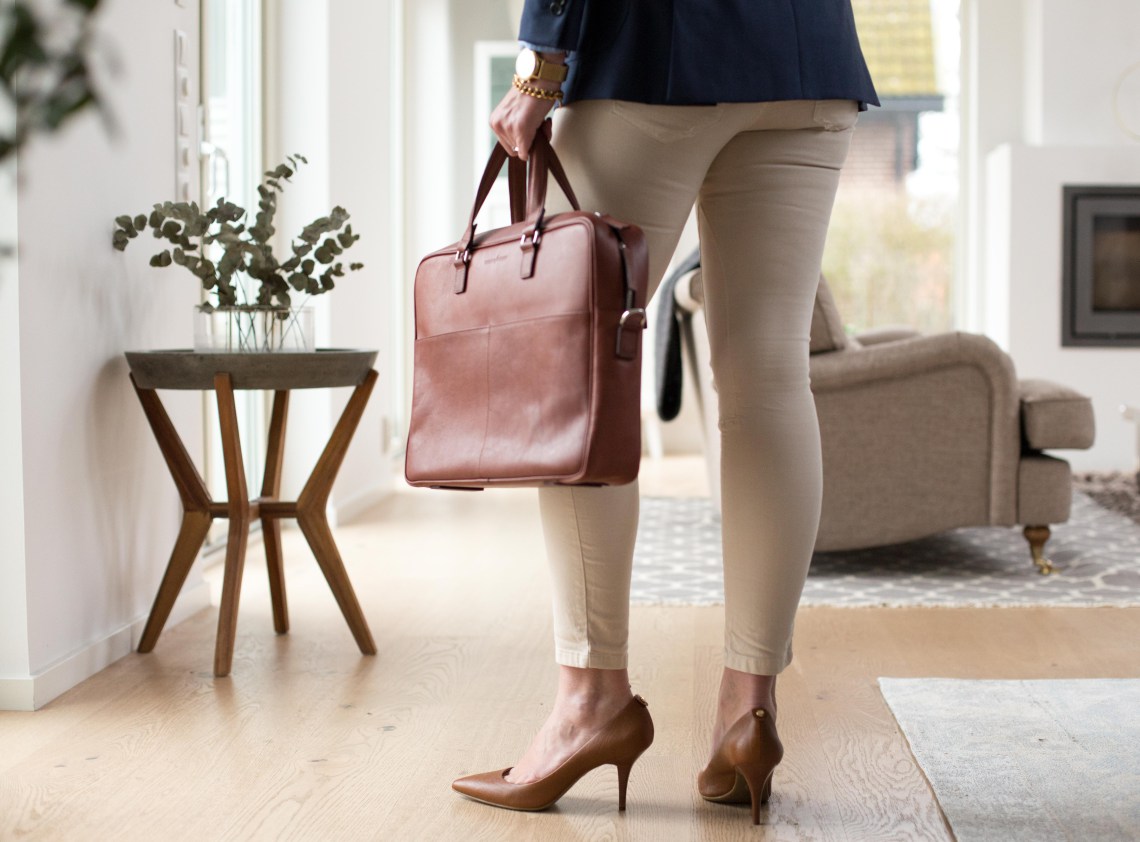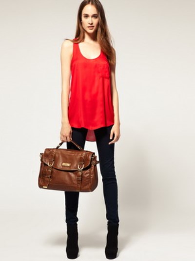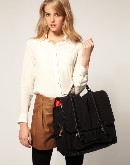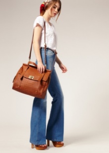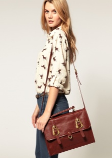 - A puffy briefcase with a short handle will harmoniously look in casual ensembles. Wear tight-fitting blue jeans or black leggings and complement them with a light contrasting shirt. Shoes should be selected in accordance with the season. A brown leather bag will look great in this simple set.