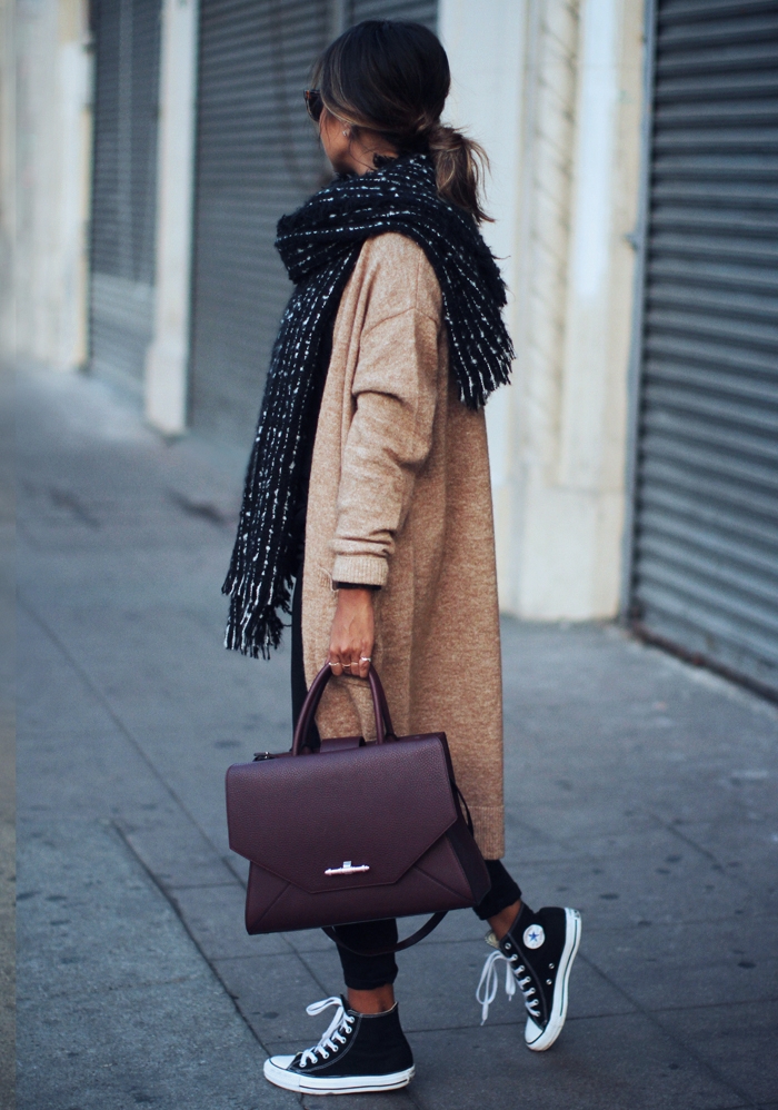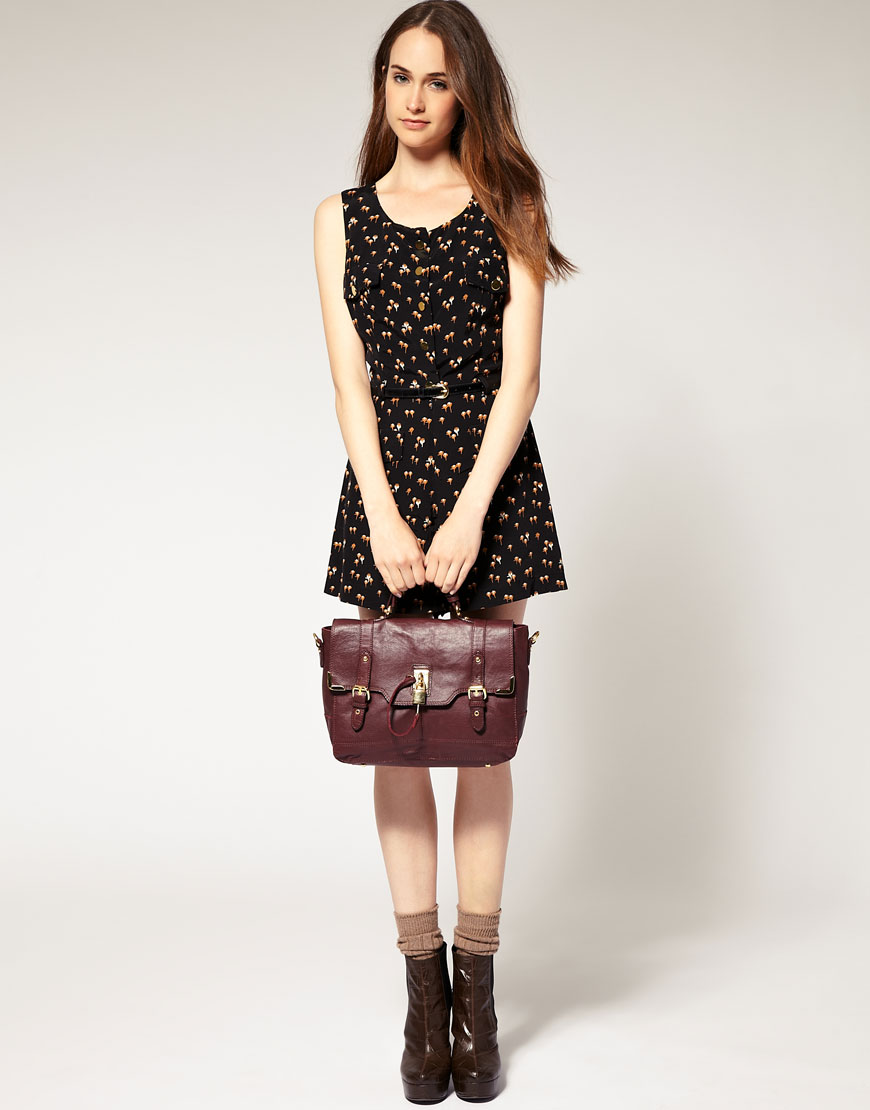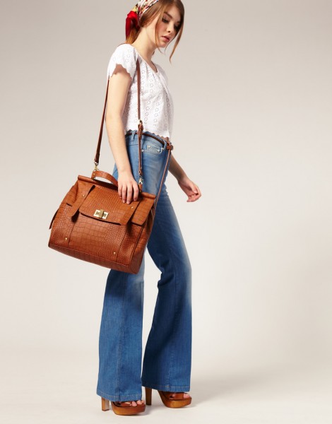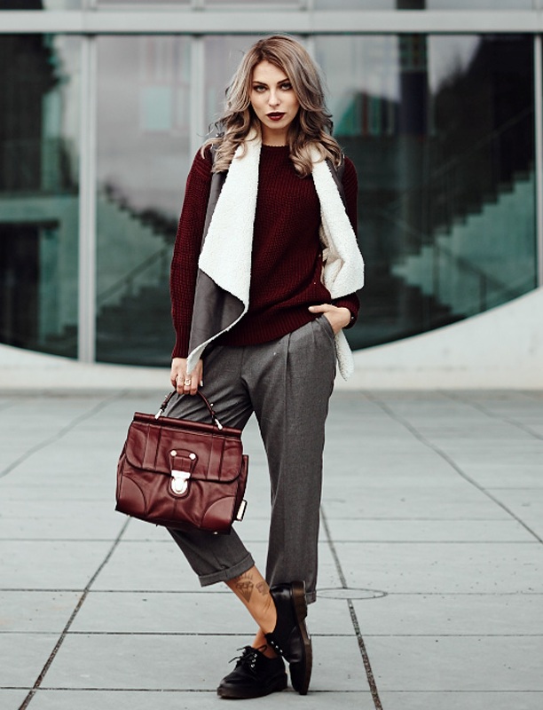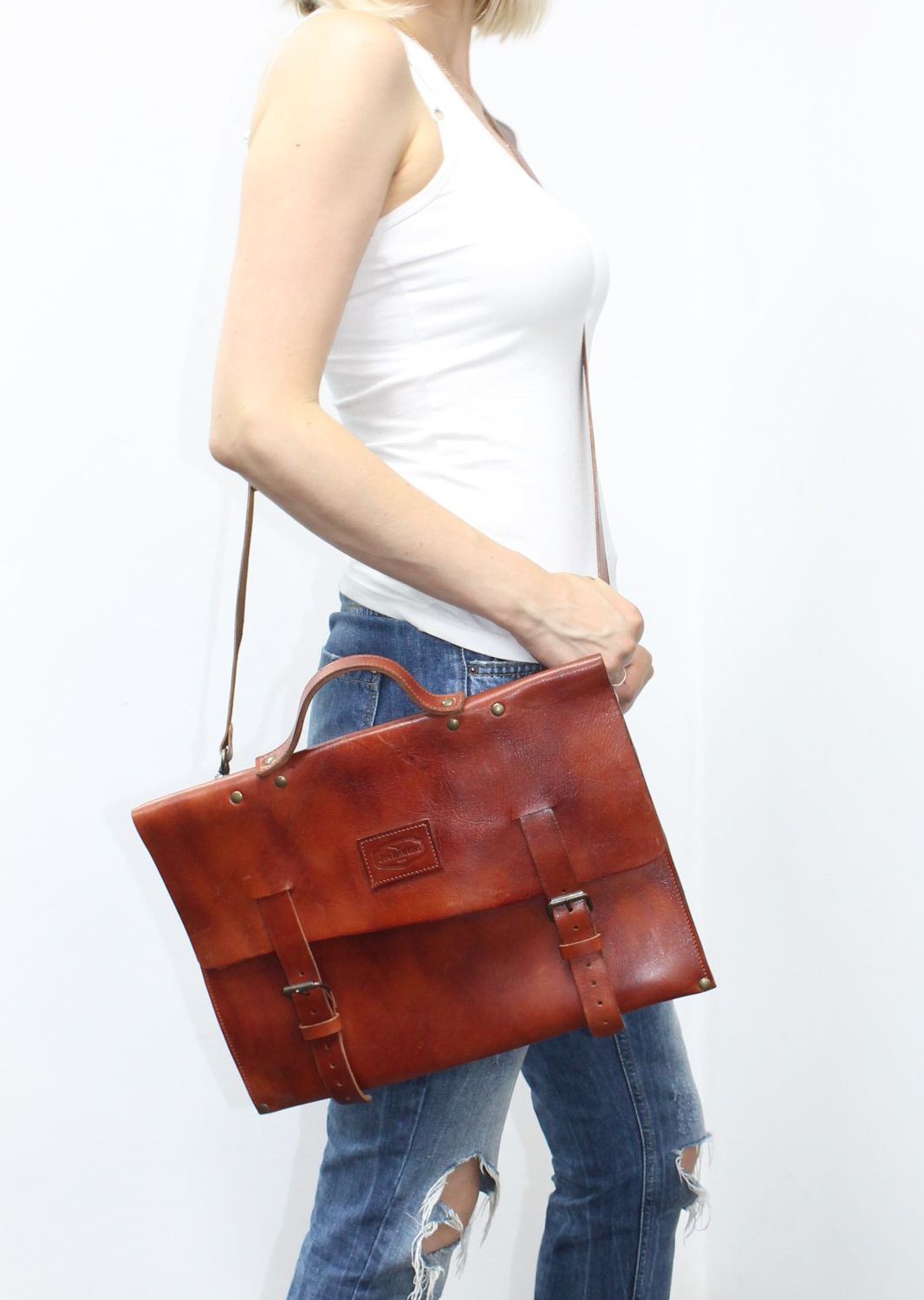- A puffy briefcase with a short handle will harmoniously look in casual ensembles. Wear tight-fitting blue jeans or black leggings and complement them with a light contrasting shirt. Shoes should be selected in accordance with the season. A brown leather bag will look great in this simple set.