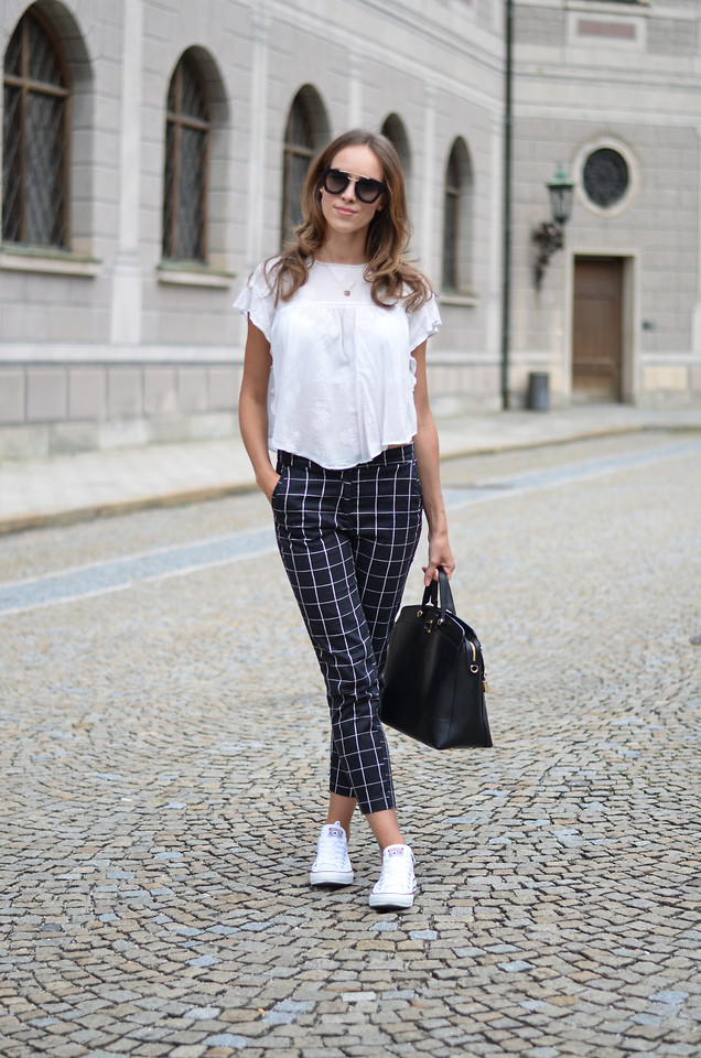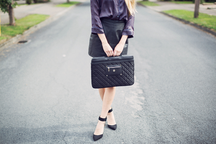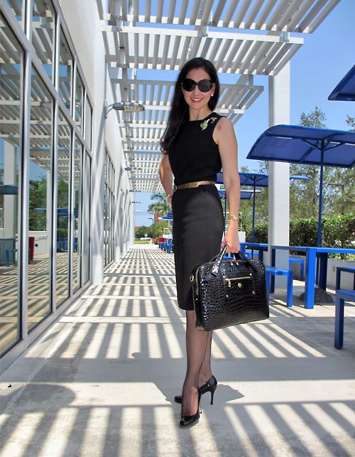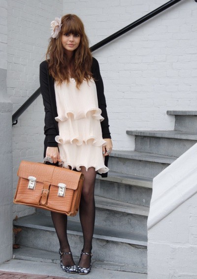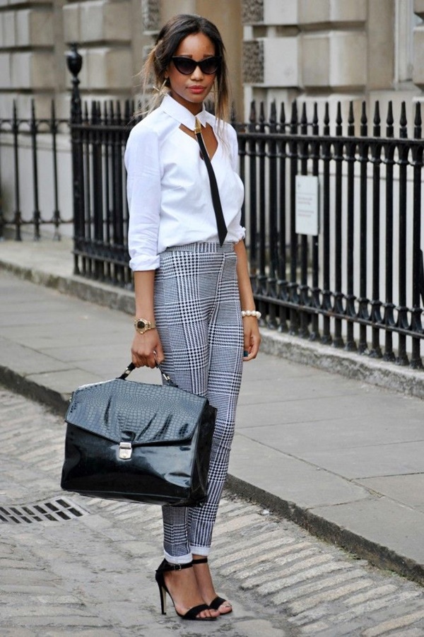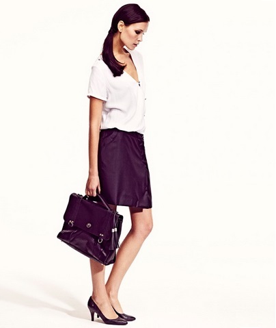 - The most common ensemble of a white blouse and a black pencil skirt looks great when it is supplemented with a dark leather briefcase.