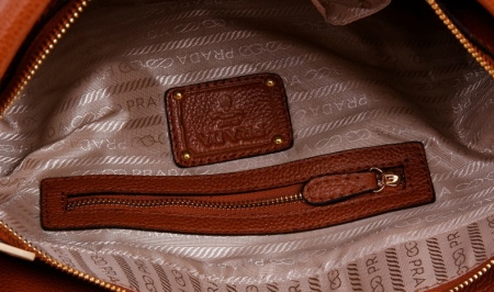 - In the inner part (on the lining) of the original bag there is a logo of the brand, made in the form of a metal plate with Prada Milano inscription in two lines. This logo is different from a fake: it has rounded edges.