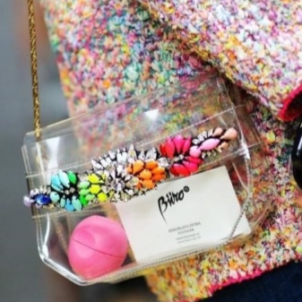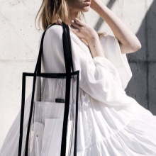 Interest in transparent bags first appeared only a couple of years ago. At first they were fashionable beach bags, then clutches, and finally, models of medium and large sizes. The advantage of such handbags is that they are extremely resistant to moisture, so even in the pouring rain they do not threaten. In addition, on the surface are less noticeable external damage - scratches, abrasions, roughness. And the care of such models is minimal - in case of contamination the bag can be simply rinsed in water.