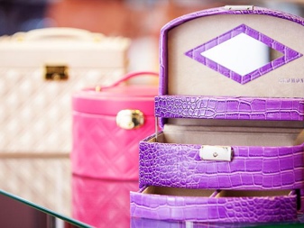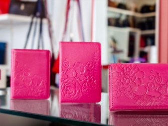 Such sets are made of leather of different colors. There are more affordable accessories from eco-leather. They are complemented by a spectacular embossed reptile skin.
