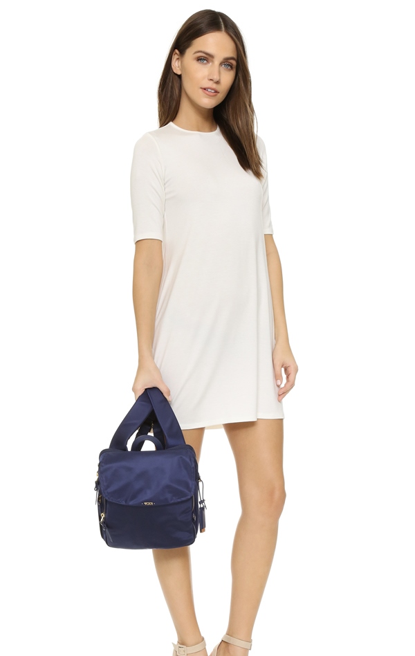 - Light and colorful backpack will look with airy girl clothes. These can be sexy tops or blouses made of thin materials in combination with straight skirts with mini length. From shoes you should choose a pair with a platform or shoes on a small heel. But such an ensemble should be addressed only to girls, since on older women it will look a bit ridiculous and inappropriate.