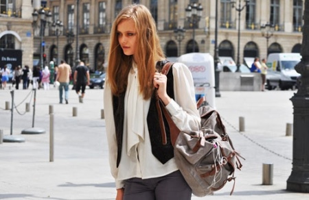 - If your backpack is made in the freedom-loving style of boho, then it is better to carry it with multilayered things in the hippie style. For example, it can be long skirts, waistcoats, sleeveless jackets, light tops, loose T-shirts or classic blue jeans.