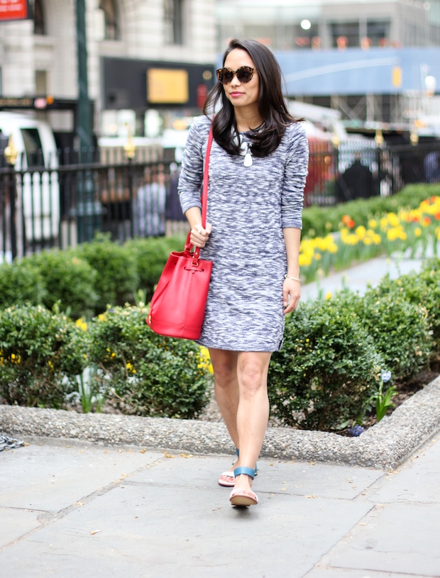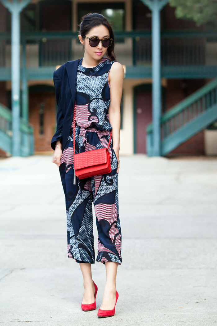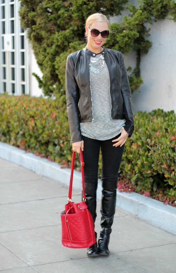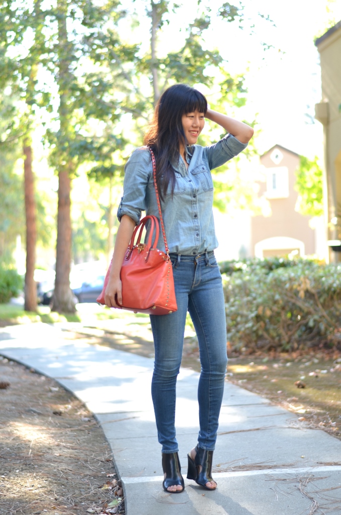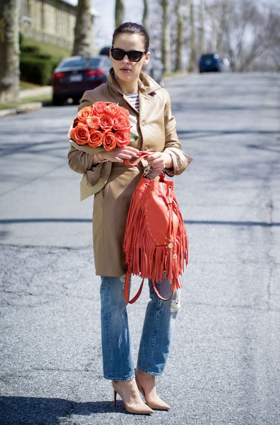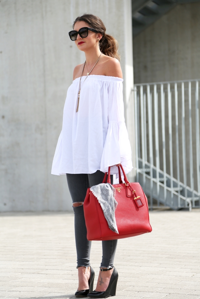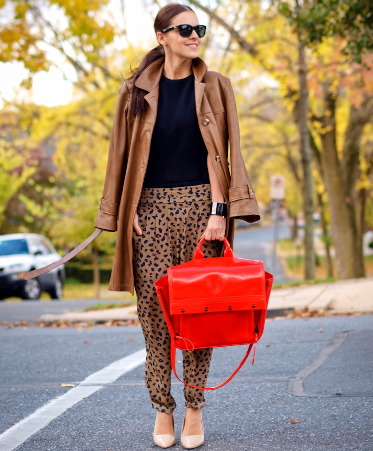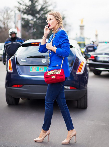 - Bright accessories look great with casual outfits. Wear a loose navy long-sleeved blouse (or 3/4), blue jeans, white sneakers and complete this ensemble with a baggy red matte leather bag with a long strap.