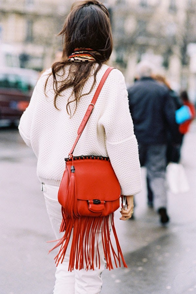 These models are made of leather, textile or suede. The classic colors of the fringed handbags are black, brown and gray. But today, designers produce very colorful and bright copies of juicy red color, and they look just amazing!