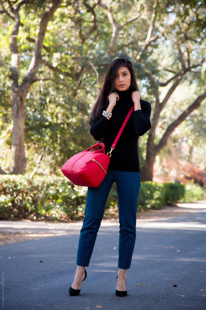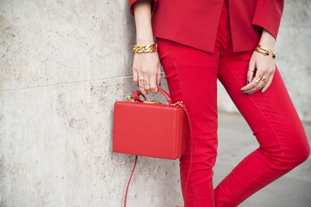 The image should contain no more than two bright red elements. It can be a bag and a scarf, a scarf, glasses, etc. If you do not adhere to this rule, you risk overloading the ensemble with colors and making it too variegated.