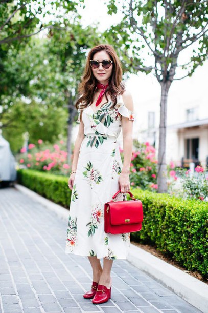 - A stylish casual set can be made from a light white dress with short sleeves and red pointed flats. A simple tandem should be completed with a small red bag with short handles and dark sunglasses.