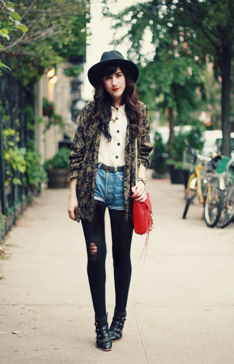 - A beautiful combination of colors will be obtained if you wear a gray elongated blouse, dark blue leggings, a jacket with a black and red print, silver-nosed shoes and finish it all with a rectangular shoulder bag.