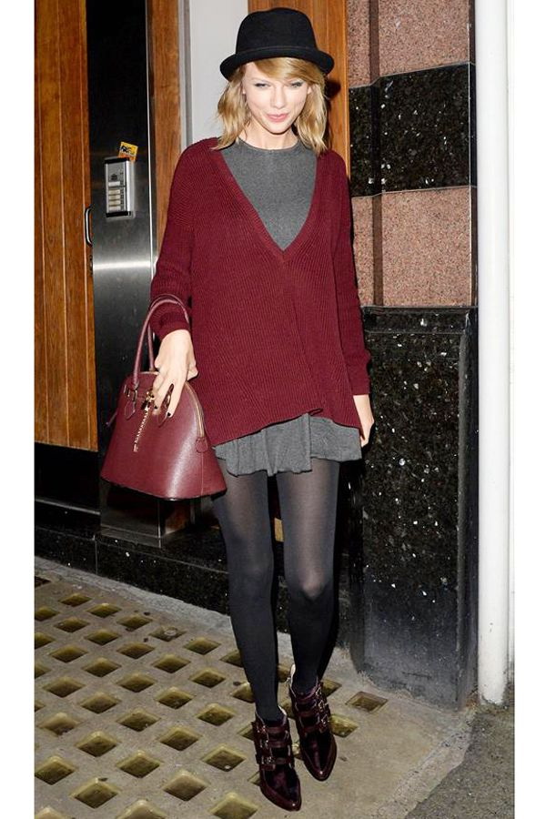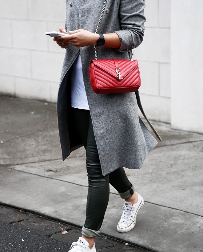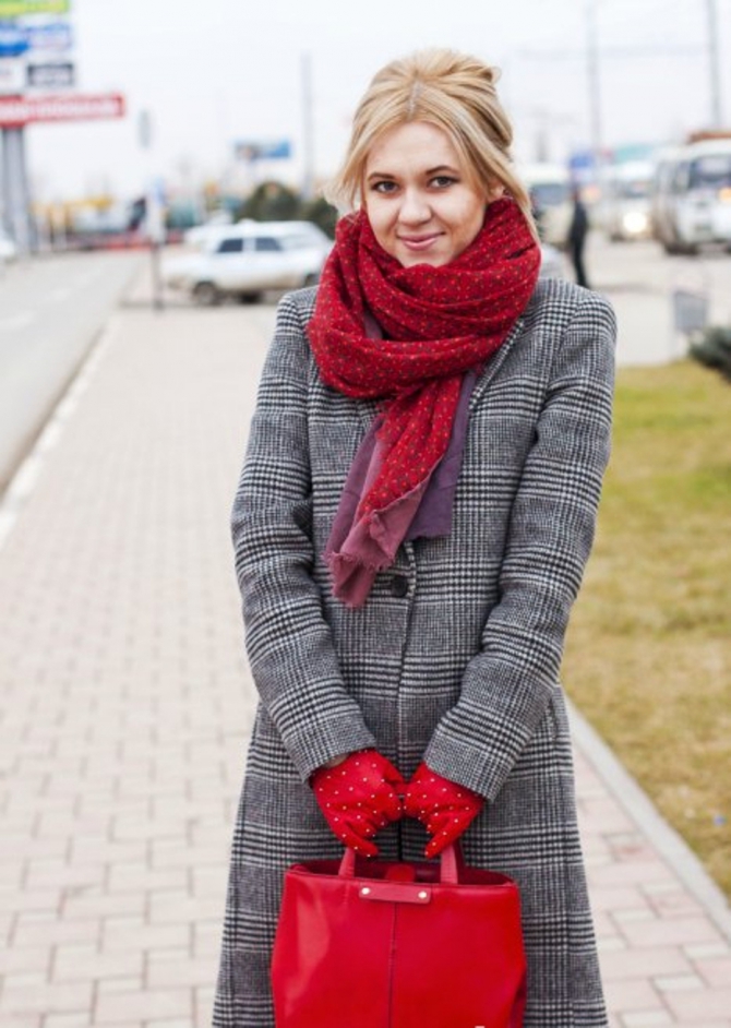 - If the weather in the yard is cool, you can put together a cozy gray coat with a soft dark red scarf, red gloves and a small bright square-shaped handbag. You can wear boots or ankle boots in black, red or brown.