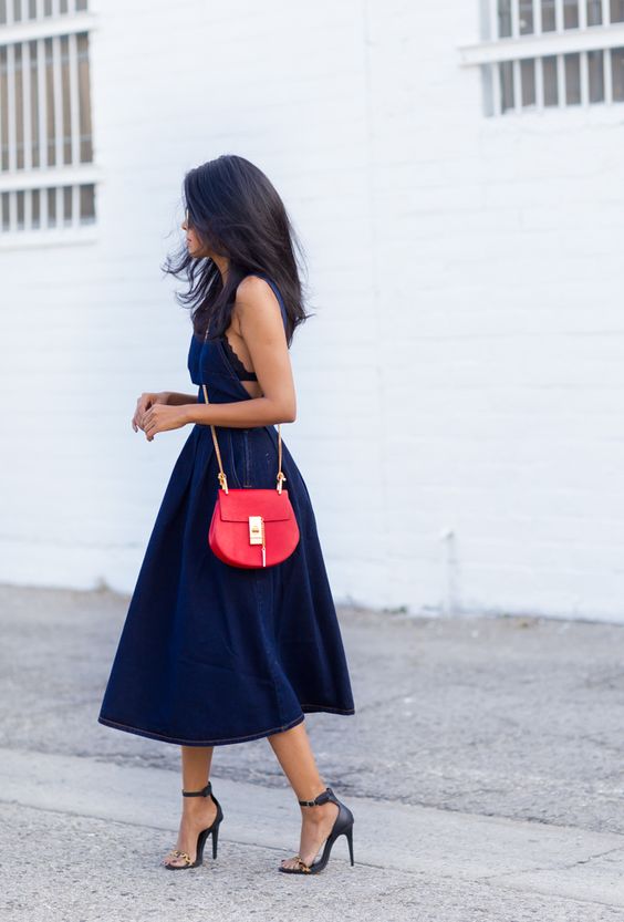 - An ensemble of an open blue dress with a long wide skirt, black sandals with thin ankle straps and a small scarlet handbag with a long chain strap will look very tender, feminine and elegant. Such a youth image is perfect for a cocktail party, a romantic date or a festive event.