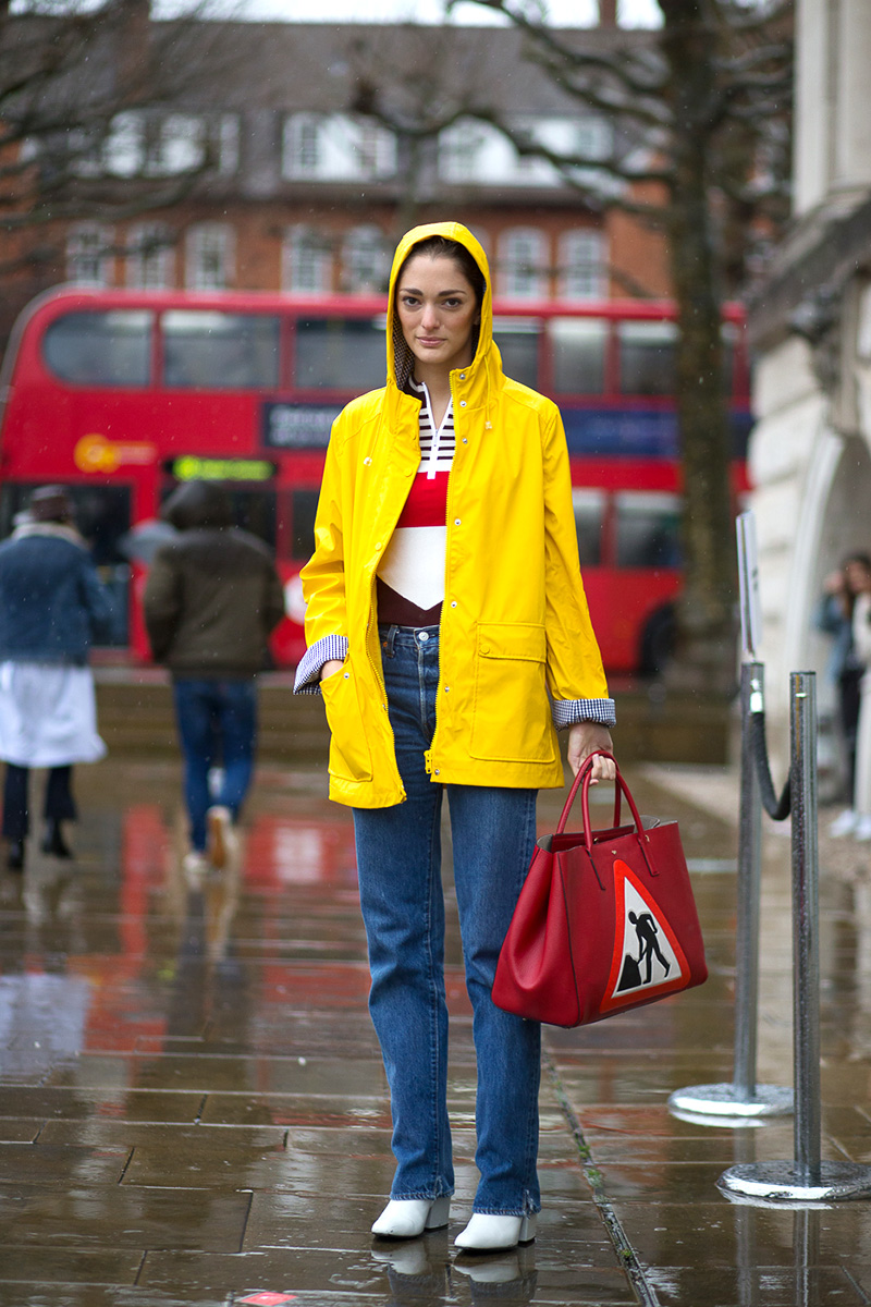 - An ensemble made of red-fitting jeans, a gray knitted blouse and a light gray cape with black buttons will harmoniously look like a warm spring. Complete this harmonious set with white sneakers and a red bag with black straps.
