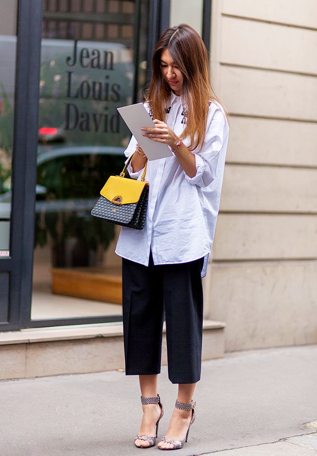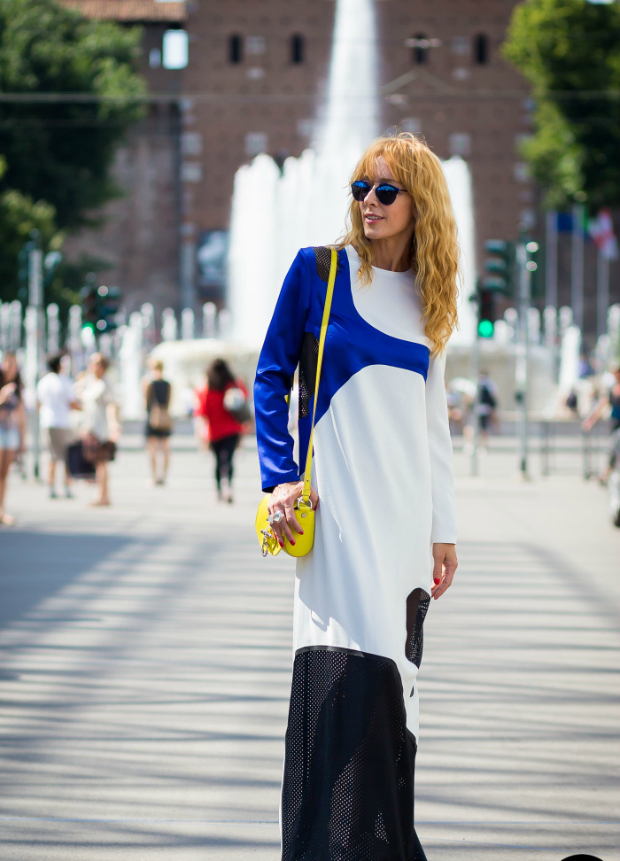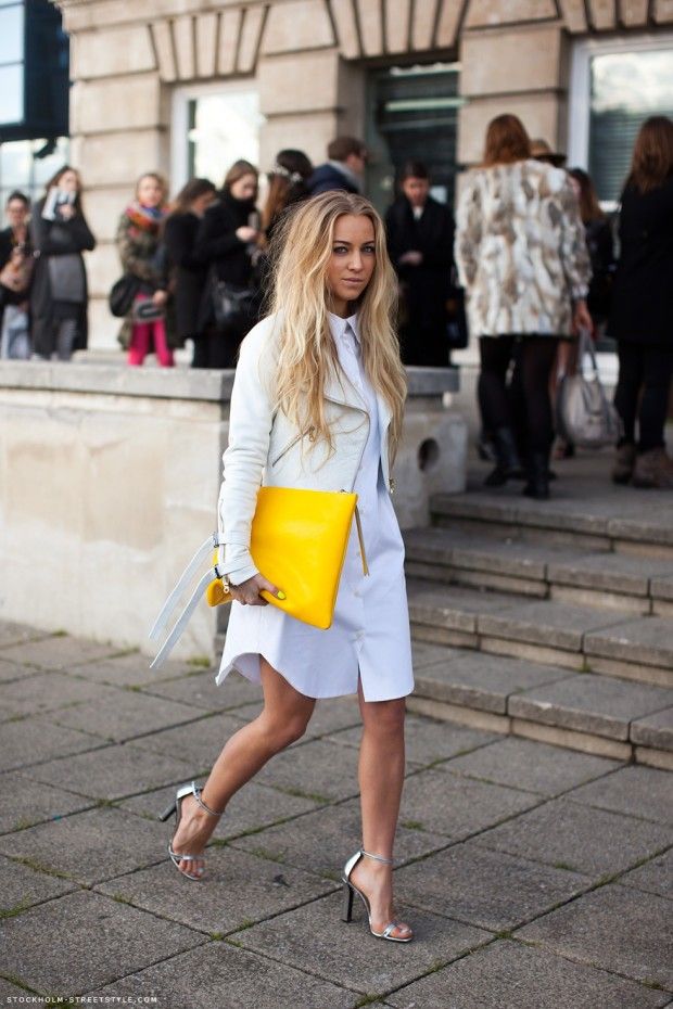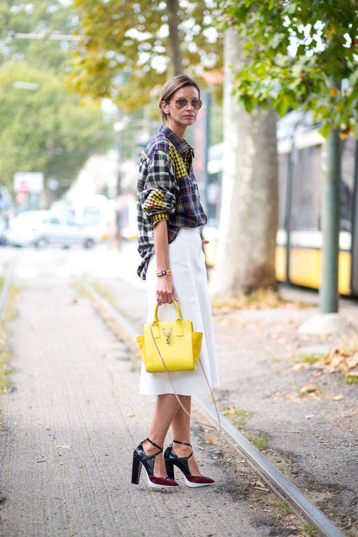 For a summer party, a romantic and gentle bow can be created using a blue short dress and yellow sandals. To emphasize the contrast more, put on a thin crimson belt. A bright clutch envelope and a discreet pendant will be the final touch. And if the parties are not in your plans now, then a small handbag will serve as an excellent addition to the business style. Yellow bright blouse, black skirt, white shoes and a bag of rich lemon hue - and the image is ready.