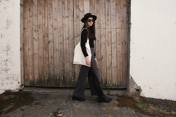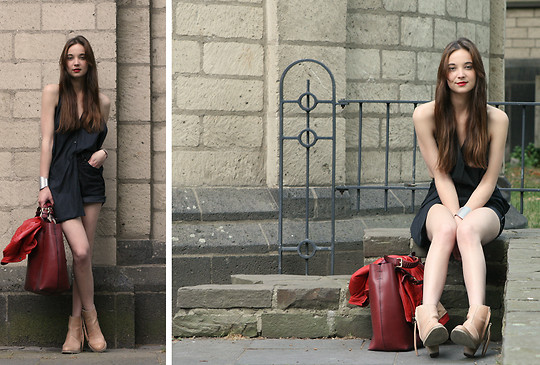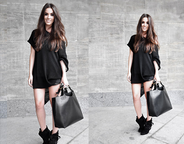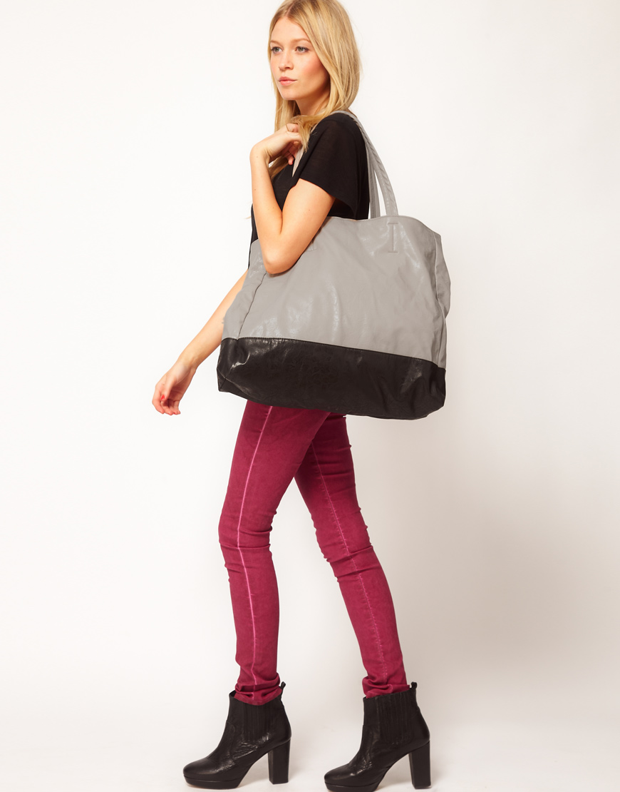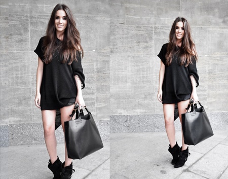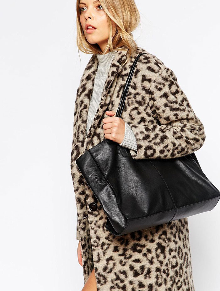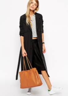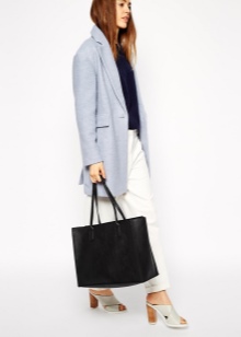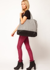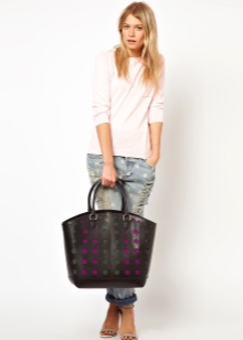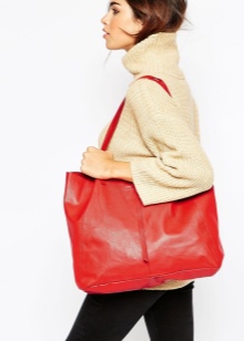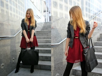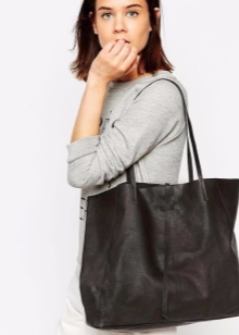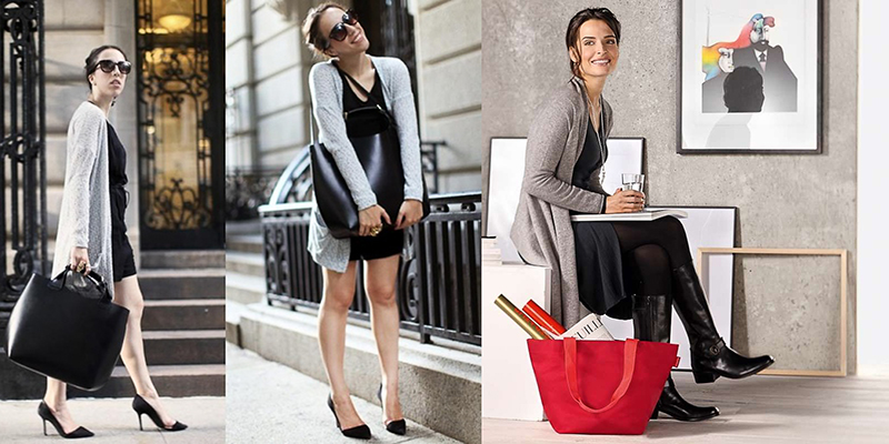 - Capacious bags look great on the background of feminine clothes. Put on a classic black dress of small length and put a gray cardigan on top. Under such a simple, but very solid set, a shiny black or red shopper model with short handles will do. It is possible to put on sharp-toed shoes on a thin stiletto heel.