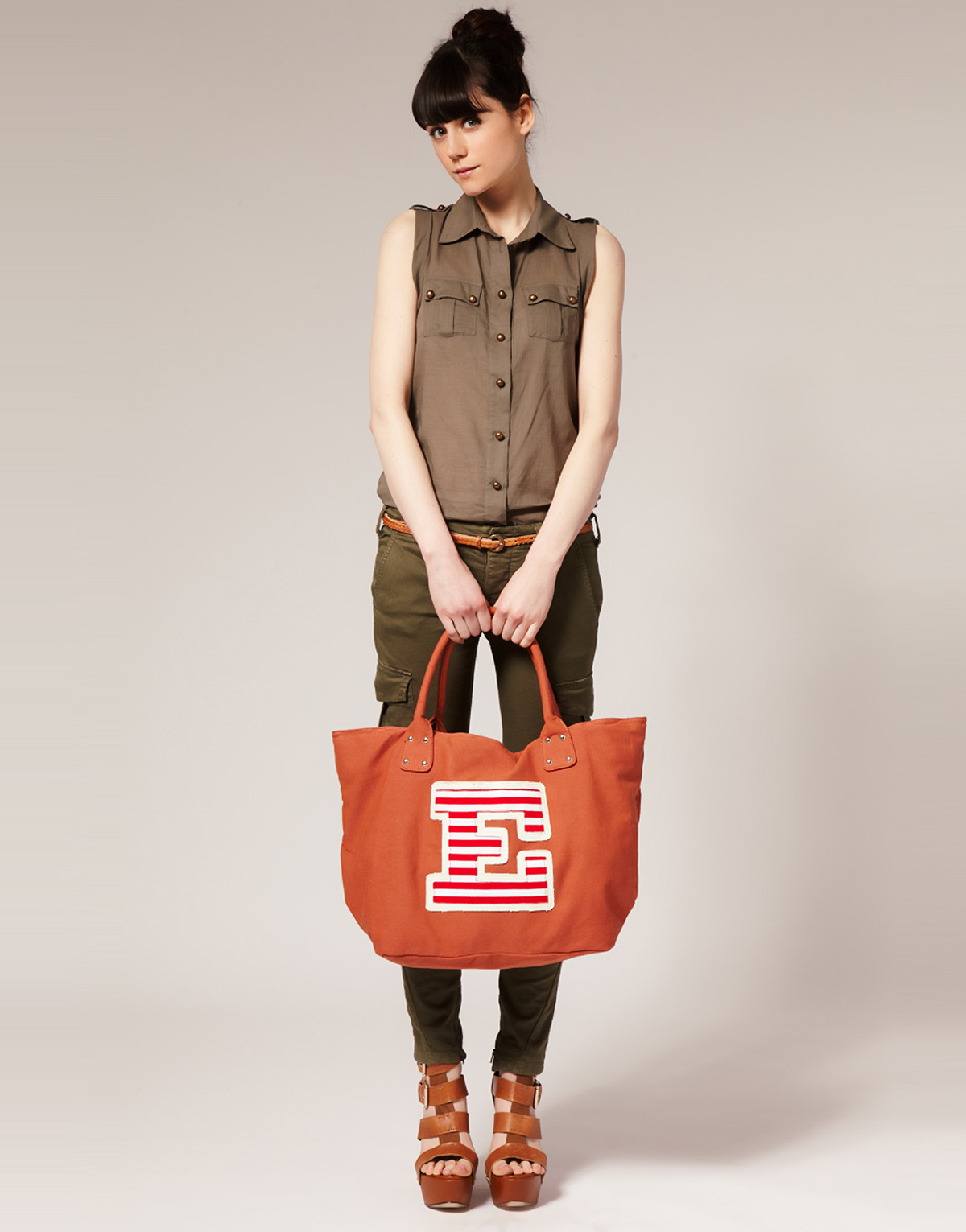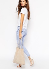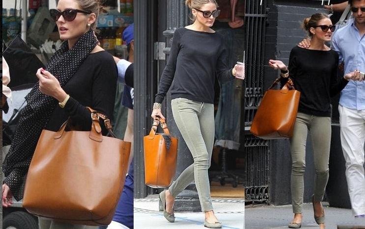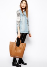 - A classic brown shopper will look harmonious with a black blouse, pistachio jeans and suede ballet flats. Such a city set can be complemented with a pea scarf in sunglasses and sunglasses.
