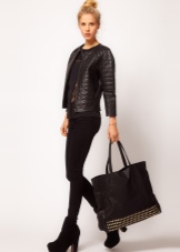 - If you have a slim figure, then you will need a sexy set consisting of leather leggings, a gray tunic and a long black jacket. Such an ensemble can be supplemented with a large burgundy shopper, a necklace with black stones and sharp-nosed shoes.