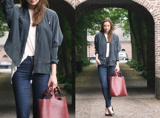 - You can create a harmonious image in casual style with a cream sweater, khaki jeans, a black jacket with a 3/4 sleeve and a dark red shopper with little hands. Shoe can be shoes on a small heel or comfortable sneakers in the color of clothing.
