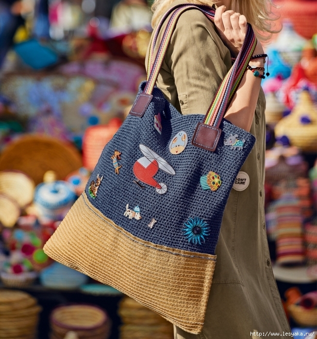 - A bag of thick, coarse material of large size is best combined with clothes in casual style: jeans, T-shirts, shorts.